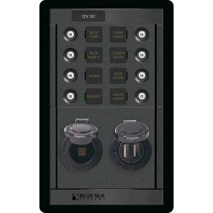 Blue Sea 1498 – 360 Panel – 8 Position 12V Panel w/Dual USB & 12V Socket